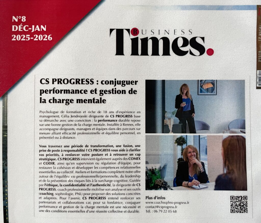 Pour en savoir plus, voici notre dernière parution dans le Business Times : CS PROGRESS : conjuguer performance et gestion de la charge mentale – Business Times Magazinehttps://business-times.fr/leadership/responsabilites-et-bien-etre-au-travail/cs-progress-conjuguer-performance-et-gestion-de-la-charge-mentale/